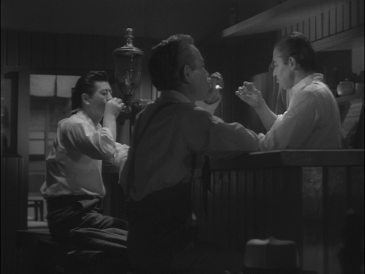 Early Spring comes together beautifully in its final half hour. A work transfer, an embittered wife, and a disappointed mistress leave Sugi completely alone in his world. When Sugi heads to a bar run by a good friend of his mentor, Ozu throws the crisis into stark relief by sitting Sugi next to an older man nearing retirement. As Sugi listens to the patron and the bartender talk about the unrewarding aspects of working life and their uncertain future, Sugi seems more downtrodden than ever. This is no more clear than when the bartender pours all three of them a drink. Sugi and the patron drink theirs in unison. Will Sugi become even more demoralized if he stays on his current path?