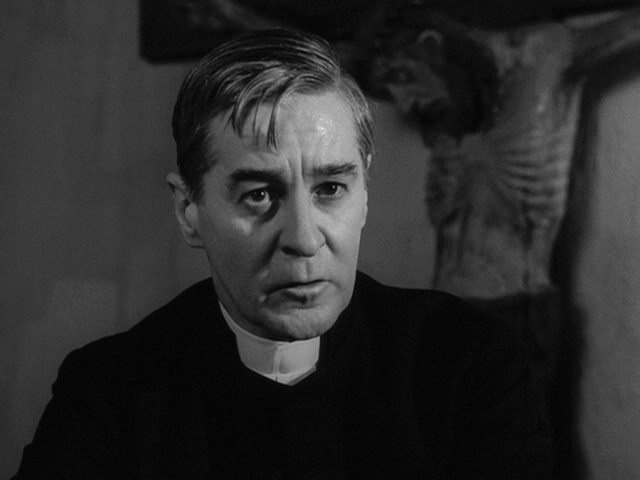 The black and white photography from Nykvist sparkles, while Von Sydow appropriately looks cut from an ancient religious icon. The film is built on a visually-oriented language that highlights shadow and closed spaces. Oppressive walls loom in the background. Tightly bunched people pray before a hovering crucifix. Dirty faces invade personal space. A fallen tree limits movement. A tall fence bars entry to undesirables. A barred door prevents escape.
