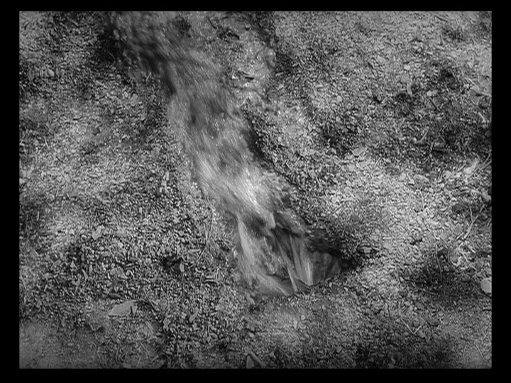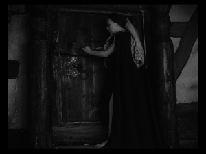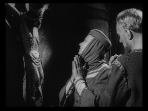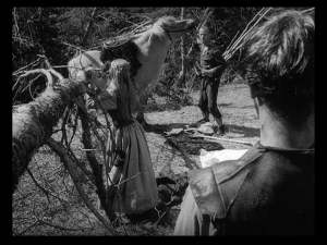Only in the final moments, when Töre awkwardly collapses in front of the stream, do we get any real sense of freedom of movement. The stream bubbles across and away from Töre into a grove of trees. Töre’s body crumples to the ground as the weight of his daughter’s death presses him downward. Bergman even adds a sound element—the chirping of birds—to bring an openness to the final sequence.