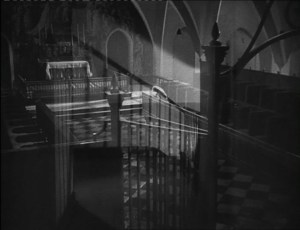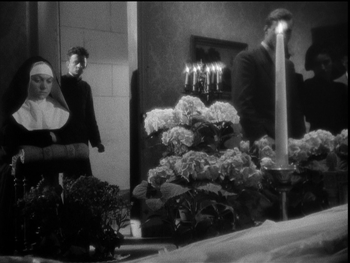 When the priest arrives in the room for the second time that day, Bresson again displays the visit in a single shot, the camera this time placed on the far side of the bed. The priest enters the room, stands at the footboard bookended by two candles, and silently prays. He then walks around to the far side of the bed and kneels into a close-up. In this case, the camera remains near the priest rather than pulling away, as it did during his first visit. The priest pulls back the muslin cover over the woman’s face, touches her forehead with his hand, gets up and walks out.