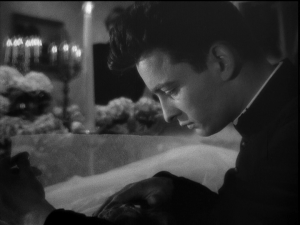 While the camera spends more time nearer (either by proximity or zoom) the priest in the first visit, the scene remains impersonal and abstract. He performs his priestly duty by blessing her and praying. However, before he arrives in the room for the second visit, he acknowledges the presence of a priest already there in an official capacity. This presents an opportunity for a more personal visit. Bresson keeps the camera further from him to begin, a distancing effect that seems to objectivize the moment. However, when the priest unexpectedly (at least based on his actions in the previous scene) moves directly toward the camera and kneels at the woman’s side, the situation is no longer a distant action. Here in extreme close-up, the priest once again raises his hand. But instead of blessing the countess as he did in his first visit, he brushes her face with his fingers. The moment feels intimate in a way reminiscent of his moment of blessing the countess earlier in the film—a moment she told him brought her a deep and abiding peace. And clearly, that previous encounter is on his mind, as he reminisces about ministering to her a peace he himself did not have—the miracle of empty hands, as he calls it.